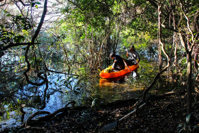 À tarde fizemos uma pequena trilha até um ponto onde os caiaques nos esperavam para um passeio pelo baía. Eu e a Verônica em um, e o Adriano e Luiza (responsável pelo ecoturismo do Instituto Homem Pantaneiro) no outro caiaque.