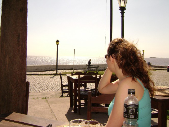 Esse dia foi de eleições na Argentina, feriado nacional, por isso imperava a lei seca no país vizinho. Andamos bastante, tiramos fotos, e fomos almoçar na praça central. Comemos muito bem, e pagamos mais ou menos barato: o câmbio no Uruguai é similar ao da Argentina, apesar da moeda uruguai levar a pior na comparação. Depois de um almoço fabuloso, fomos até a “praia” do Rio Plata, onde eu busquei uma sombra de árvore junto a algumas pedras, e ali mesmo dormi cerca de meia hora; Marie se jogou na areia mesmo, queria se queimar um pouco...a moça era branca como uma vela.