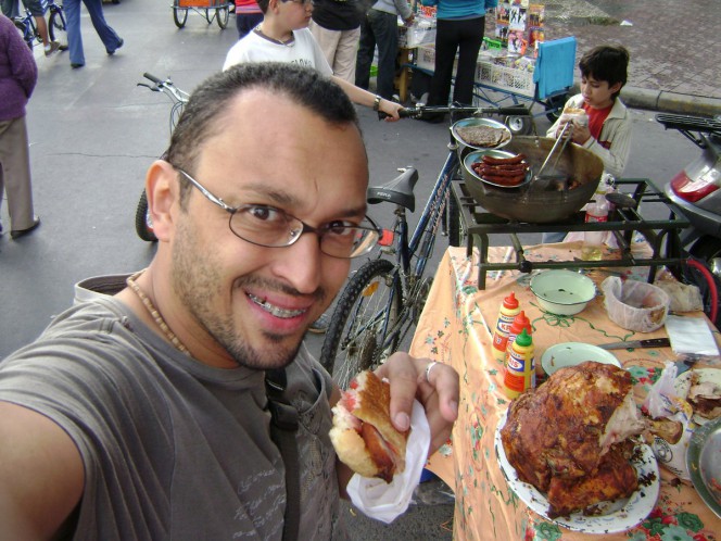 Experimentei um sanduba chamado sanduiche de chola, feito com uma carne de porco chamado chaka, uma saladinha de tomate, cenoura e alface por cima, vinagre e sal. Paguei Bs. 5, e aí testei duas coisas: como pechinchar preço na Bolívia, e ver se sobrevivo a comidas de rua por aqui. Por hora, me saí bem nas duas (o sanduíche custava Bs. 7... rs). Se você já ouviu falar de uma certa falta de higiene no que se refere à comida servida na Bolívia, eu diria que há um certo exagero nisso, pelo menos no que vi até agora. Mas realmente não existe um cuidado maior com a limpeza, não. A senhora que me serviu o sanduba fatiava o chaka e manuseava tudo com as mãos nuas, nem uma luvinha ou garfo... Bom, isso é Bolívia.