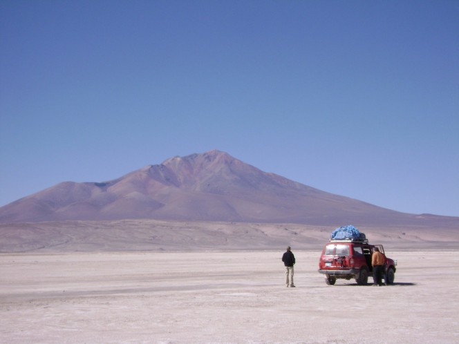 Seguimos para o que seria o dia mais longo do tour, e também o mais cansativo. Passamos pelo Salar de Chiguana, um salar menor que o de Uyuni, mas igualmente bonito. Em seguida tomamos a estrada de areia até o mirante do vulcão Ollangue, de cujo topo sai fumaça constantemente. Apesar do sol, faz muito frio nesta região. Quando se sai da Land Rover, nunca é desagasalhado.