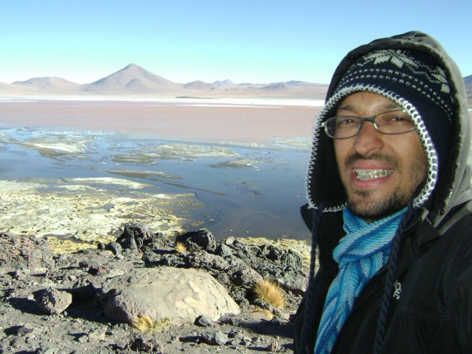 Depois dessa peregrinação por lagunas, seguimos adiante e chegamos ate o monumento natural Arbol de Piedra: como diz o nome, parece uma árvore de pedra, só que esculpida pelo vento. Esse mesmo vento que faz a gente se sentir dentro de uma geladeira, a despeito de estarmos em um deserto. Para fechar o dia cansativo, chegamos ao nosso local de pouso, e também o mais bonito de hoje: Laguna Colorada. Esta laguna se localiza dentro do Parque Nacional Eduardo Avaroa, que por sua vez esta dentro do Desierto de Siloli. A laguna é uma imensa porção de água avermelhada, lotada de flamingos por todos os lados que se olhe, e rodeada de montanhas. Altitude de 4.278 m. Como havia sol ainda, segui até o mirante para ver a laguna do alto. Foi um espetáculo, e valeu bastante a pena de um dia cansativo.