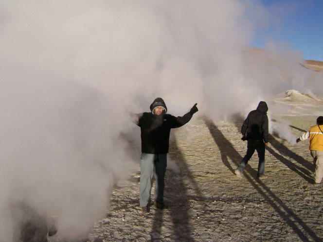 Meus pés estavam congelados, uma sensação que eu não recomendo para ninguém. Até o sol nascer, e até uma hora depois, o frio é absurdo. Nesse ínterim, paramos para visitar os gêiseres, soltando vapor d´agua quentíssimo a 5000m de altitude. Deu um certo alívio ficar ali, pôr os pés e mãos naqueles jatos de vapor que saem dos buracos no chão, a cerca de 100ºC. Isso se dá devido ao contato da água no subterrâneo com a lava. Mas o cheiro de enxofre é forte, ou seja, cheiro de ovo podre…