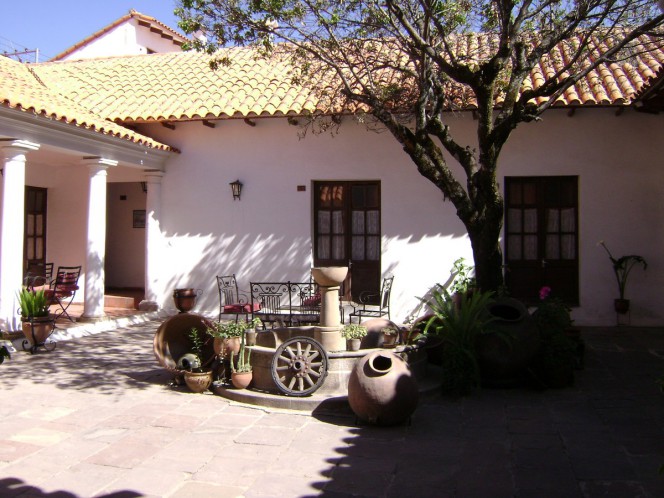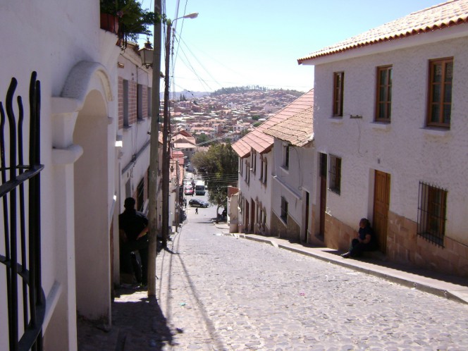 Chegamos a Sucre por volta das 8h, doze horas de viagem. Cansado. Mesmo assim, fui até a central de infos turísticas pegar uns mapas e saber sobre hospedagem. A moça que me atendeu, Deise, uma simpatia. Vi algumas bem em conta mesmo (vejam abaixo, em Dicas), mas acabei escolhendo o Hostal Cruz de Popayan (calle Loa 881. Tel.: 644 0889). Ambiente gostoso, um casarão antigo muito bonito, com jardim interno. O quarto é sem banheiro privativo, mas tv a cabo e o café da manha estão incluso. Bs. 65, bom preço. Nem me atrevi a deitar, peguei as minhas coisas e fui andar.