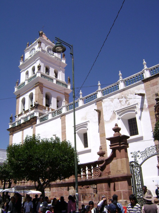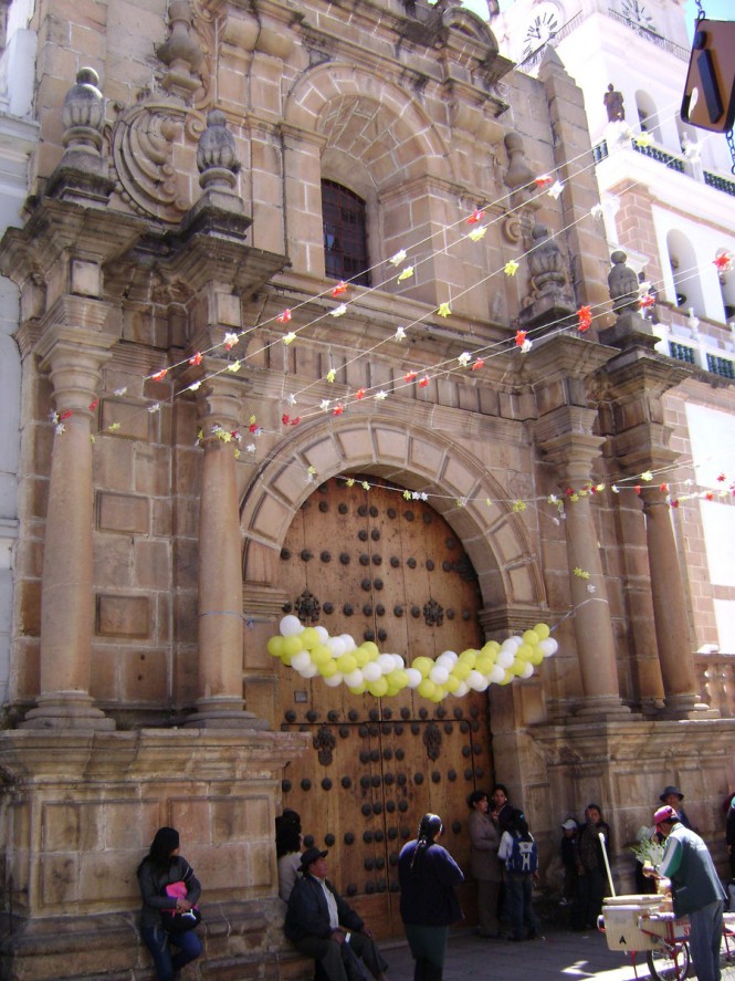 Continuei a caminhar, verdadeiramente me senti muito à vontade em Sucre. Lugares que visitei na sequência: Paróquia de San Lázaro, Templo de Santa Clara, a plazuela Bernardo Monteagudo. Foi então que eu me deparei com uma carreata em homenagem a Virgem de Guadalupe: os carros todos decorados com bichos de pelúcia, notas falsas de dinheiro, flores. Havia bandas, foguetes, tudo muito animado em plena Plaza 25 de Mayo, a principal da cidade. Fui seguindo aquela carreata por um tempo. Logo voltei minha atenção para a Plaza 25 de Mayo, lindíssima, cercada de vários prédios magníficos: sede do Departamento de Chuquisaca, sede da Prefeitura, Capilla de la Virgem Guadalupe, La Casa de la Libertad. Fiquei por ali não sei quanto tempo, apreciando, até que o cansaço da viagem cobrou seu preço. Voltei ao hostal, fui dormir um pouco. Até porque até as 15h muita coisa fica fechada por causa da siesta.