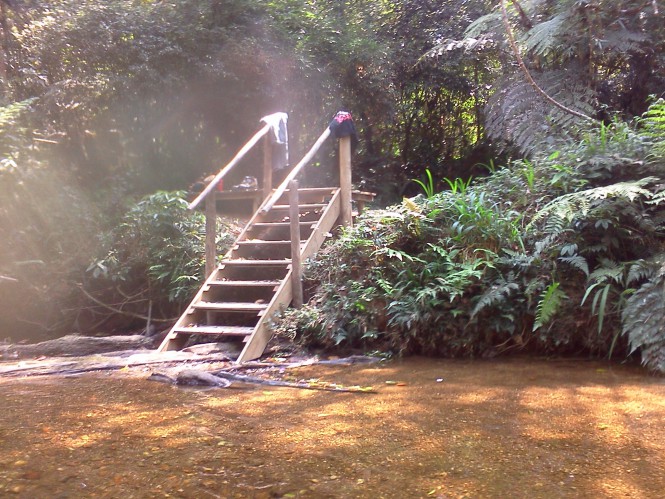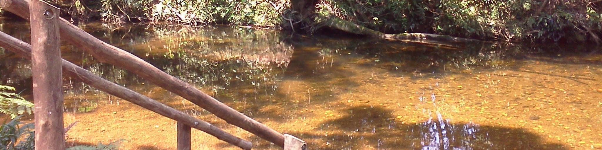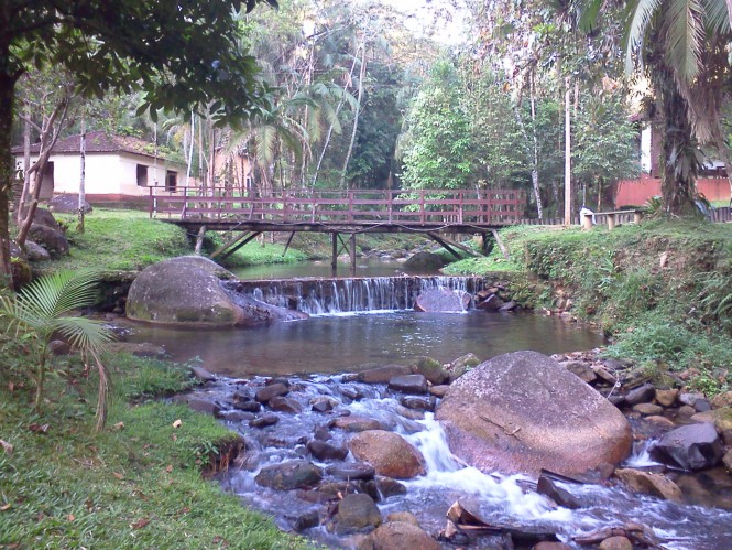 Acordei cedo depois de uma boa noite de sono. Como o Sr. Tércio havia me dito na noite anterior, pela manhã o responsável pelo parque, um cara simpático chamado Márcio, me preparou um mapa bem ilustrativo de como eu chegaria à Cachoeira do Travessão (também conhecida como Cachoeira Alta), uma queda que fica exatamente na divisa do parque com uma propriedade particular. Tomei um café rápido e saí do parque às 10h20 em direção ao bairro de Rio Preto (ou Nazaré), na zona rural da cidade de Sete Barras (SP). O trajeto total levou cerca de 18 km, em uma sequência de estradinhas de terra que vão se enfiando mais e mais para dentro de um gigantesco bananal, produto principal do glorioso Vale do Ribeira. Chega a confundir a quantidade de “ruas” de bananal que vão cruzando o caminho principal. Depois de alguma dificuldade e da ajuda de uma turma de agricultores que iam cuidar da plantação, cheguei ao que eles chamam de “rotatória”, que é uma clareira uma a estradinha acabava. Dali, eu deveria pegar uma trilha, que saía tímida de um ponto da “rotatória”. E segui pela trilha, que logo começou a margear o Rio Ipiranga e suas pedras.