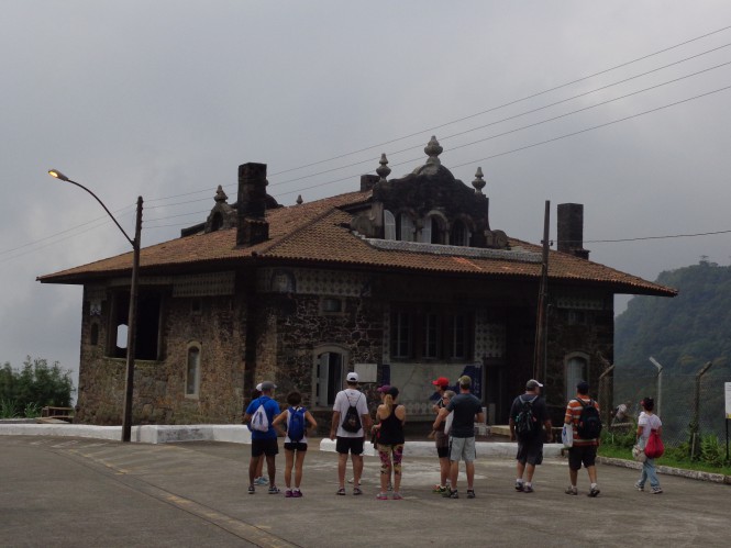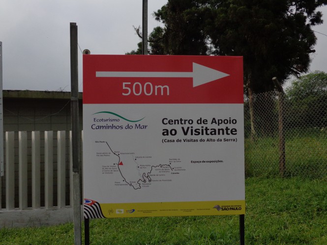 Apresentações e identificações feitas, entramos finalmente no núcleo por volta das 9h30. Depois de estacionar os carros e de uma breve explanação da guia do parque, seguimos a pé em direção à parte da Estrada Velha que começa a efetivamente descer a serra em direção a Cubatão. No trajeto existem diversos monumentos e locais de visitação, e a primeira delas ocorre no que é hoje o Centro de Visitantes, onde dá pra usar o banheiro e ver uma exposição permanente sobre a construção e manutenção da usina Henry Border, que se localiza no meio do caminho que passaríamos.