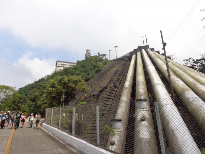 Seguindo em frente, passamos pelos enormes tubos que descem a serra abaixo, levando a água que gera energia nas turbinas da usina, logo acima. Um pouco mais abaixo, e temos contato com o primeiro fragmento da histórica trilha chamada Calçada do Lorena, primeiro caminho pavimentado construído na época do Primeiro Reinado, em 1790. Considerado na época um dos caminhos mais modernos da colônia.