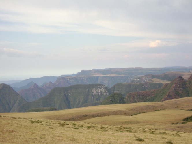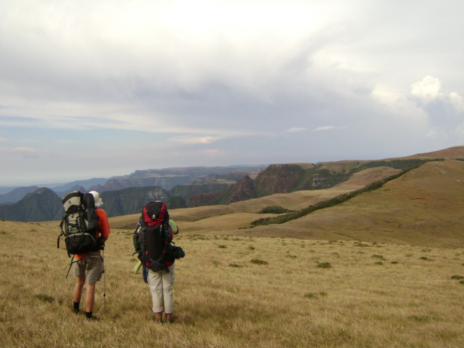 O dia amanheceu com céu limpo. Conforme havíamos combinado, se isso acontecesse, seguiríamos em frente. Metade do grupo (Cela, Chantal e Jolie) resolveram voltar para Urubici. Nós resolvemos seguir. Subimos o morro e alcançamos um platô. Chegamos em uma cerca, pulamos e seguimos. Avistamos uma cadeia de montanhas, e logo a frente, os primeiros cânions. Alegria geral e esperança de visual. Seguimos. Mais uma cerca. Nem parece que a área é parque nacional, tamanha quantidade de cercas e propriedades privadas.