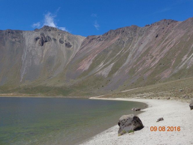 Peguei a trilha à minha direita e segui pela crista da cratera, até começar a descer a encosta, cheia de pedras soltas. Tive um desnível de uns 300 metros até chegar à beira da Laguna del Sol, a grande lagoa que domina a maior parte da área da cratera. Segundo informações a profundidade dessa lagoa é de 14 metros, formada por chuva e degelo eventual. Água límpida e com vários peixes vivendo ali (cheguei a ver cinco peixes grandes juntos). Segui contornando a Laguna del Sol, caminhando devagar e curtindo o silêncio da montanha (naquele momento só eu estava na cratera). Essa conexão com a montanha, com a terra, é que me recarrega.