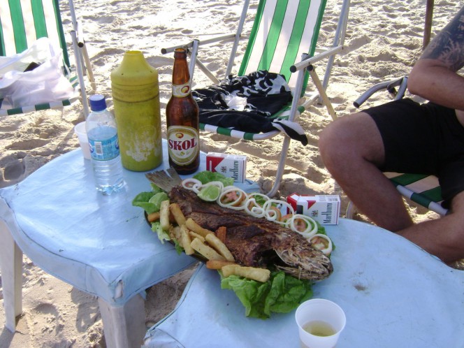 Almoçamos ali na barraca do Edi mesmo, uma pescada amarela de mais ou menos 2 kg: não sobrou nada do pobre peixe, que foi servido com macaxeira. E umas doses de Pitu, a cachaça tradicional lá do PE. O Edi é uma daquelas figuras alegres e bom papo que faz a gente passar as horas sem perceber. E papo com o Edi é sempre divertido, pode apostar.