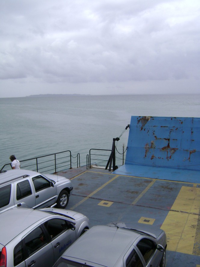 Saímos de Valença por volta das 9h. Posso dizer que o hotel Onda Azul é muito bom, apesar do preço ter saído bastante da média por nós estipulada. Seguimos em frente, depois de termos parado num quiosque de infos turísticas, para pegarmos um mapa. Ali fiquei sabendo que até Bom Despacho (o local de onde os ferry boats partem para Salvador) levaria uma hora e meia; também ficamos sabendo do horário de partida do próximo ferry: 11h15. O asfalto da BA 001 até a ilha de Itaparica é um pouco ruim, com bastante buracos. Mas por volta das 10h20, chegamos ao porto de Bom Despacho. Pagamos os R$27,60 do carro, mais R$3,35 de um passageiro. Total: R$30,95. Numa travessia estimada em 50 minutos.