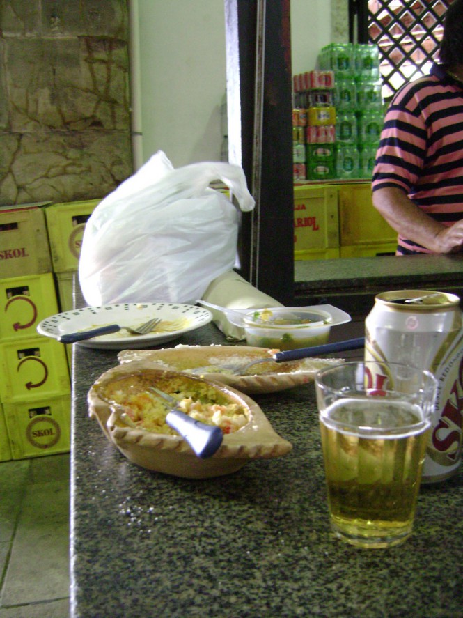 Dito e feito, arrumamos uma vaga por um agrado de R$2,50. Saiu barato...em Salvador, as coisas funcionam bem quando rola um “agrado”. Visitamos a Igreja de Nsa. Sra. Conceição, belíssima, mas um pouco mal cuidada. Seguimos então para o Mercado Modelo. O local é um mercado municipal que vende artesanato e comidinhas, muito frequentado por turistas e baianos em geral. O clima é um misto de barganha, malandragem, diversão e prazer. A arquitetura é muito bonita, e a todo momento somos abordados por algum vendedor, te oferecendo qualquer coisa, tipo relógios, colares, etc. Mas é possível fazer bons negócios lá. Acabei comendo um peixe-agulha e tomando um caldinho de sururu; logo depois dividimos uma casquinha de siri, que aqui se chama siri cascão, que eu fui entender quando o prato pousou no balcão: era enorme!