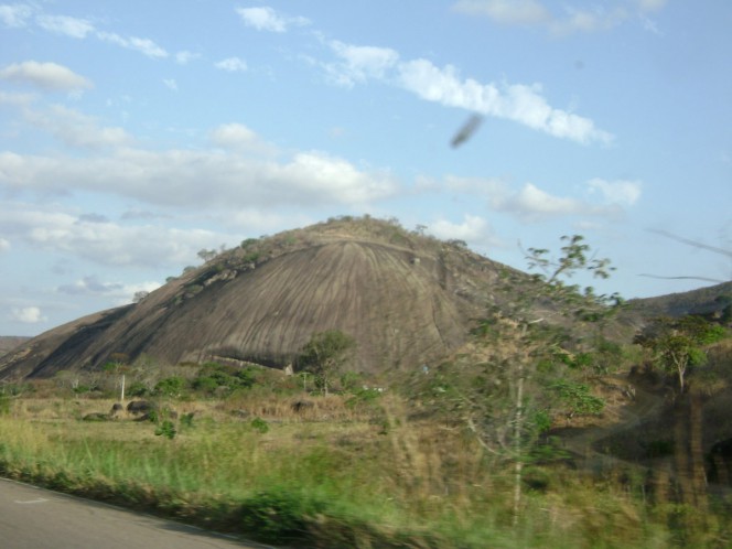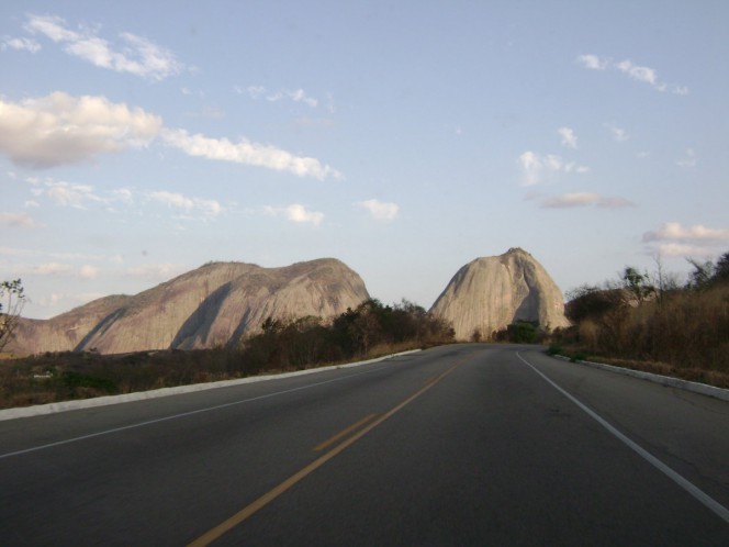 Logo de cara se percebe a grande quantidade de caminhões. Mas já estamos acostumamos com a 101, então tudo certo. A diferença aqui é a quantidade de retões de 40, 50 km. Poucas curvas...por isso o caminho é mais curto por aqui, em relação à BR 101. Passamos por um local chamado Itatins (BA), lugar com umas formações rochosas impressionantes, montanhas e morros no meio do sertão. Eu já havia passado por aqui em 2004, voltando de uma temporada em Natal (RN), e igualmente já havia me impressionado.