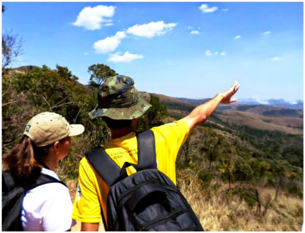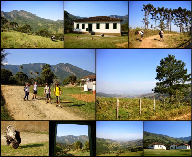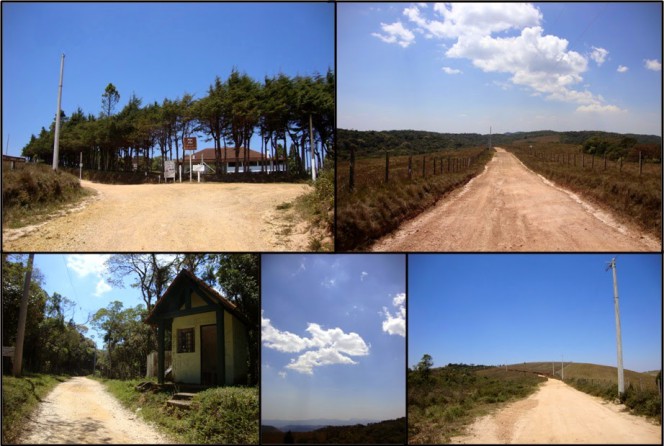 Continuamos a caminhada, eu sempre comparando o trajeto in loco com o do mapa, verificando altitude e horário, até que chegamos a uma sombra no fim da subida principal e fizemos uma pausa para um lanche reforçado. Voltamos a caminhar com o Sol castigando nossas cabeças até que chegamos ao acesso ao Mirante São José dos Alpes, porém não fomos até ele, pois teríamos que caminhar por mais de 1 km fora do nosso percurso e estávamos com o cronograma apertado (em breve voltarei de carro a esse ponto só para ir a esse mirante e pretendo levar a Juliana, o Jay e o Luiz – meus parceiros dessa trip). Chegamos ao ponto mais alto e caminhamos em meio à paisagem deslumbrante da Mantiqueira. De um lado esquerdo da estrada o Parque Estadual de Campos do Jordão e do lado direito a imensidão da Fazenda Lavrinhas.