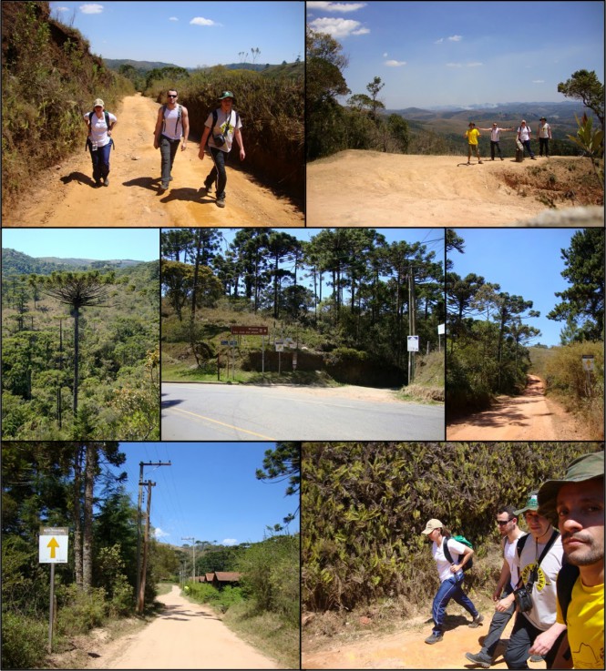 Após fazermos alguns alongamentos iniciamos a caminhada. De trecho em trecho encontrávamos placas da Rota Pedestre (Rota Franciscana) e do Caminho de Aparecida. Passamos por uma minúscula vila do Parque e iniciamos a subida. Durante toda a subida tivemos a companhia das araucárias, da vegetação baixa e do silêncio da região. Raramente um veículo passava por nós e quando passava, levantava uma grande nuvem de poeira a qual não demorava de baixar. A temperatura estava bastante elevada – o que tornou a caminhada um pouco desgastante, porém mantemos sempre um bom ritmo de caminhada e o bom humor.