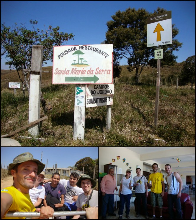Chegamos a bifurcação 3 – exatamente na divisa de municípios de Campos do Jordão e Guaratinguetá e paramos para mais um descanso. Mal sentamos e uma picape Chevrolet Chevy 500 veio da bifurcação e logo gritei: “carona!”. A Juliana complementou: “cabe 4?”. O motorista – o Sr. Jaime, prontamente atendeu a nossa prece. Ele, mais 4 jovens, faziam manutenção da rede de alta tensão da região e passariam na Pousada Santa Maria da Serra para almoçar e seguiriam para Pindamonhangaba e passariam exatamente pelo percurso que faríamos a pé. Subimos na picape e em poucos minutos chegamos à pousada. Como estávamos com o cronograma vencido decidimos esperar a equipe da picape almoçar, para continuarmos o trajeto de carona até a bifurcação 4, onde eles continuariam a viagem e nós seguiríamos para a Cachoeira do Onça. Enquanto isso, tomamos uma cerveja e ficamos a descansar no saguão da pousada. Essa carona “veio a calhar”. Pudemos recuperar o tempo do plano inicial e irmos até a cachoeira.