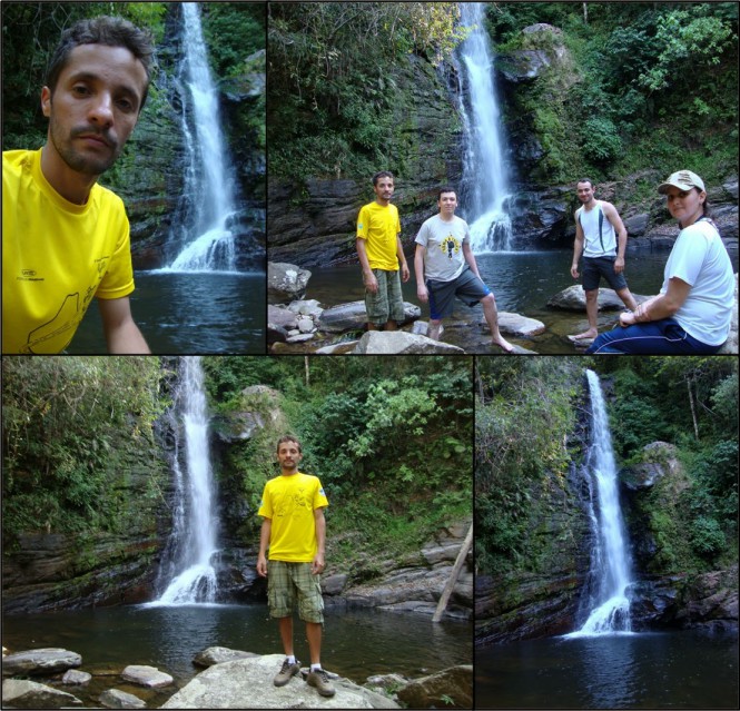 Após esperarmos um rebanho passar apressadamente, descemos por uma estrada particular por uns 500 metros e atravessamos por uma campina, tendo que passar por uma cerca de arame farpado e entramos numa trilha com mata fechada, mas com traçado bem demarcado. Depois de uma descida de uns 100 metros, chegamos a parte de baixo da Cachoeira do Onça e nos refrescamos parcialmente nas gélidas águas da piscina natural ao pé da cachoeira. Por causa do horário da saída do ônibus, ficamos apenas por uns 15 minutos para descansar, fotografar, contemplar e se molhar. Num futuro bem próximo retornarei a essa cachoeira para ficar o dia todo!
