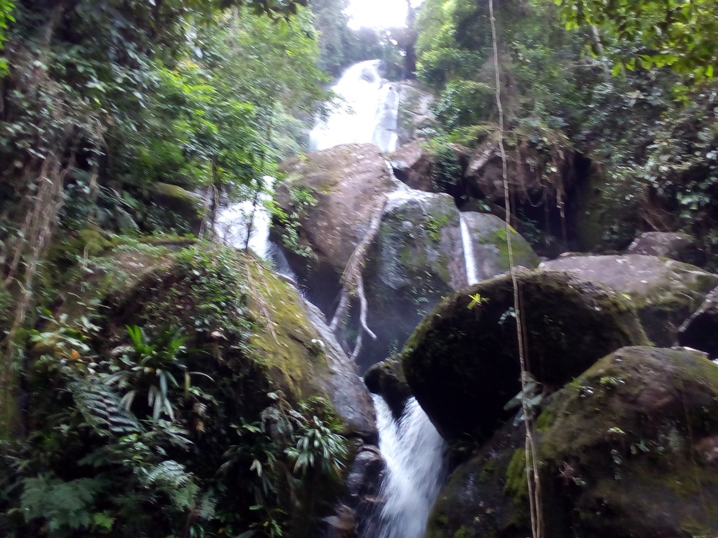 Ainda no alto da serra do lado de cá do Rio Quilombo entre uma abertura e outra no meio da vegetação conseguimos ver uma grande queda d’água descendo a serra do outro lado que estávamos, sem dúvidas era ela! Em linha reta uns 3 km para dizer o mínimo, mas ainda tínhamos que descer um zigue zague daqueles até cruzar o rio e subir do outro lado.