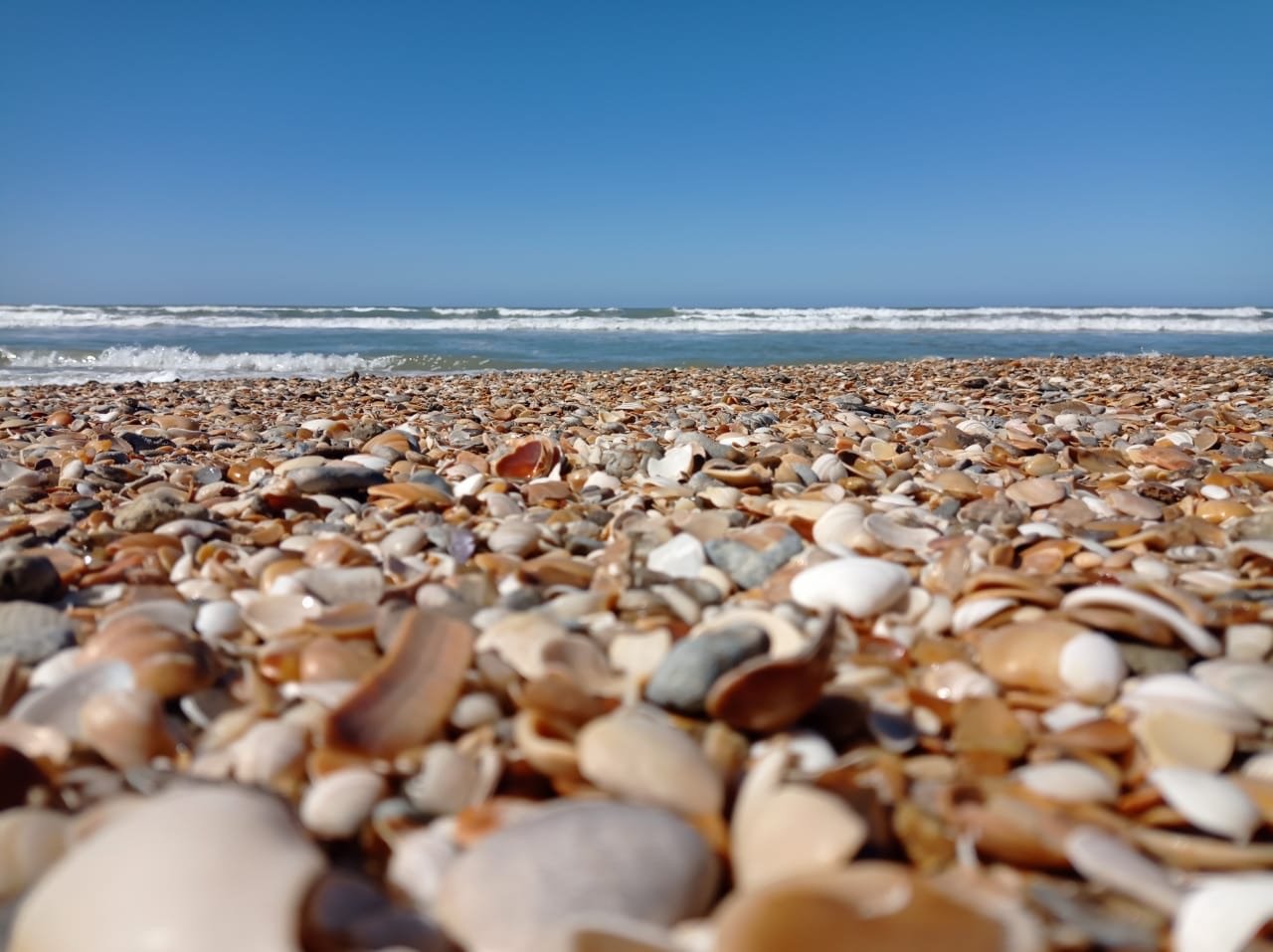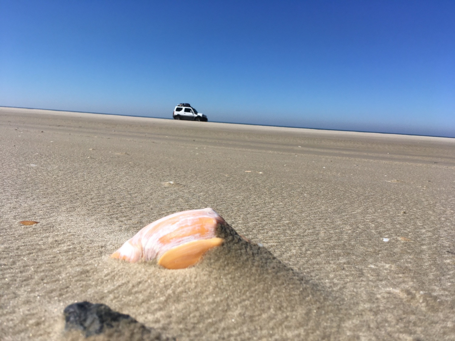 Até o Farol do Albardão, a beira do mar onde nos deslocamos de carro é praticamente plana e compacta, a areia parece asfalto, porém, a partir desse ponto, começamos a encontrar os conchais, aglomeração de conchas quebradas que cobrem a areia e se transformam em um atoleiro para o carro.