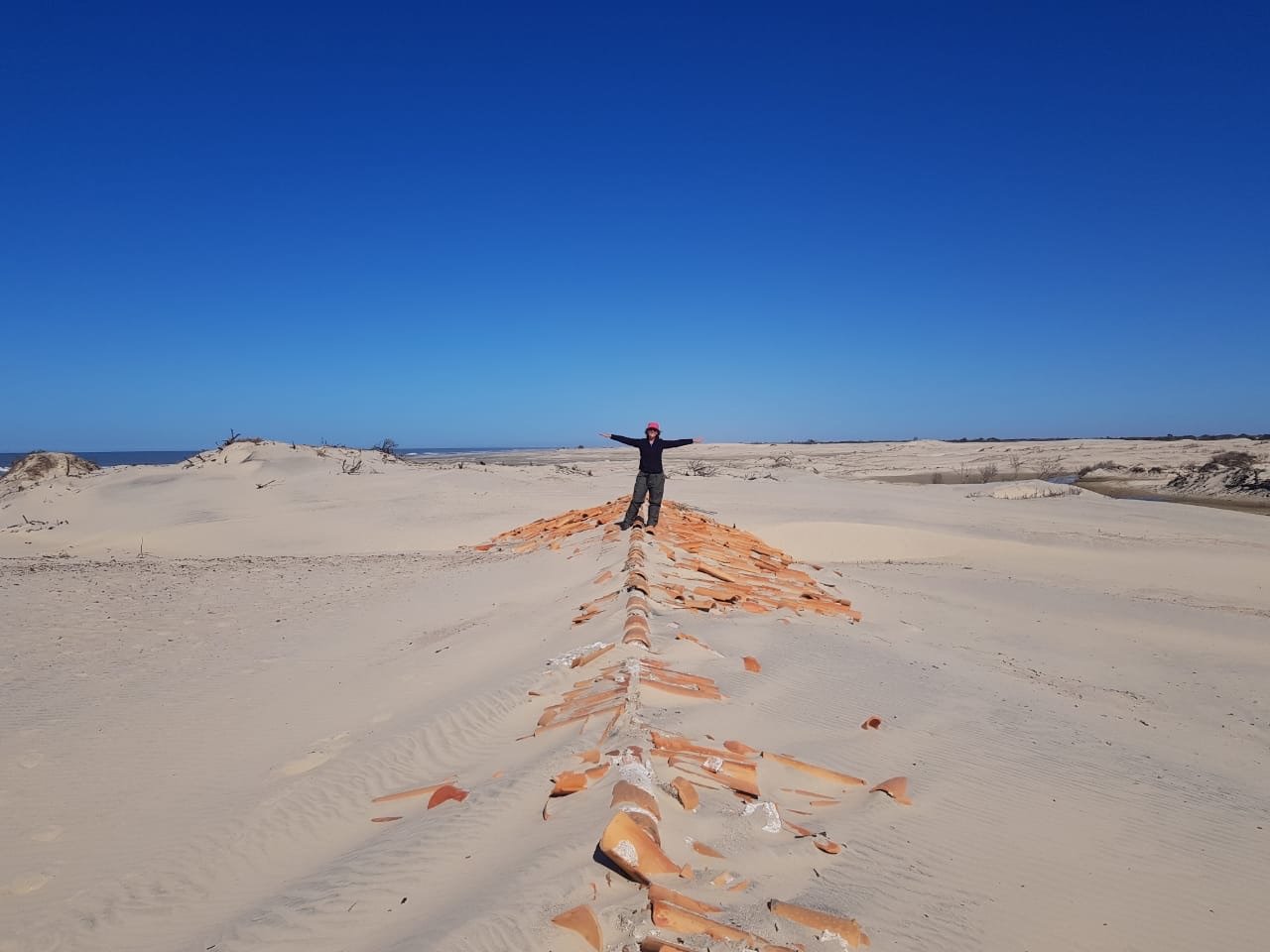 barco, que foi saqueado, restando somente parte do seu casco. Então, Ismael teria passado a morar nas proximidades do hotel abandonado (não encontramos com ele por lá...). É preciso ficar de olho no campo de dunas, pois o hotel fica a uns 300m do mar e um pouco escondido, sendo possível avistar apenas um pouco do telhado, porque está praticamente coberto pela areia.