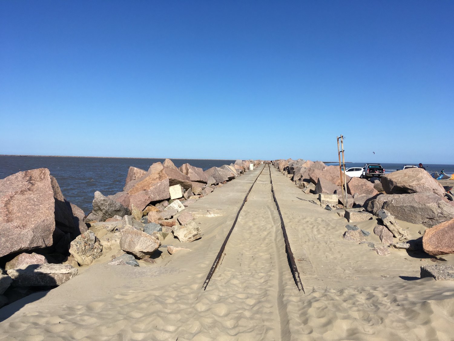 Depois do almoço, rumo aos Molhes da Barra do Cassino, ponto final da viagem pela beira da praia. Depois de 114km, chegamos aos molhes, onde queríamos andar de vagoneta, mas, devido à pandemia, não estão operando. O Molhe de Rio Grande/Cassino (molhe oeste) foi idealizado em 1909 e construído efetivamente em 1915 e tem 3.160m de extensão. Juntamente com o Molhe de São José do Norte (molhe leste), este com 4.520m de extensão, tem a função de delimitar um canal seguro para acesso ao complexo portuário de Rio Grande. As pedras foram trazidas de Capão do Leão e Monte Bonito, através de uma linha férrea que chegava até o local. O canal possui 500m de largura e 12m de profundidade, e, por ele, passam anualmente cerca de 2.200 navios. No Molhe de Rio Grande, existem trilhos e vagonetas, movidas à vela, para transporte de pescadores esportivos e turistas.