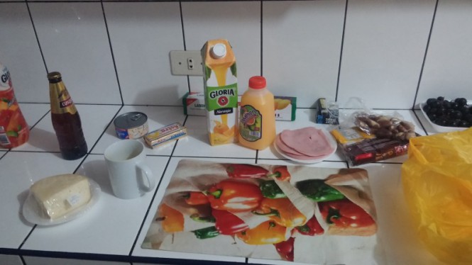 Comprei suco, pão, queijo branco, bolachas, miojo e atum, claro, e a alimentação do outro dia.
