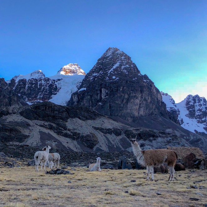 Acordamos por volta das 7 horas da manhã e, ao abrir a barraca, percebemos que um rebanho de llamas nos rodeava. Não imagino o motivo dessa visita assim tão cedo, mas com certeza elas tornaram a paisagem ainda mais espetacular.