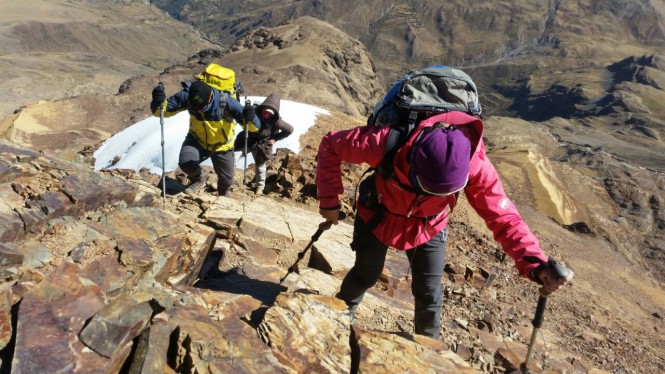 A trilha começava com uma subida longa e pouco íngrime, por uma morena de terra e pedras soltas. Após cerca de duas horas caminhando por esse terreno, começamos a margear um paredão. A subida então se tornava muito acentuada, com pequenos trechos de escalada bastante expostos. Quase chegando ao campo alto, nos encordamos e seguimos por mais dois lances escalando as rochas. Esse talvez nem seria considerado um trecho muito difícil, não fosse pelo fato de estarmos no meio da madrugada, a quase 5000m de altitude, pisando com as enormes botas duplas em rochas quebradiças.