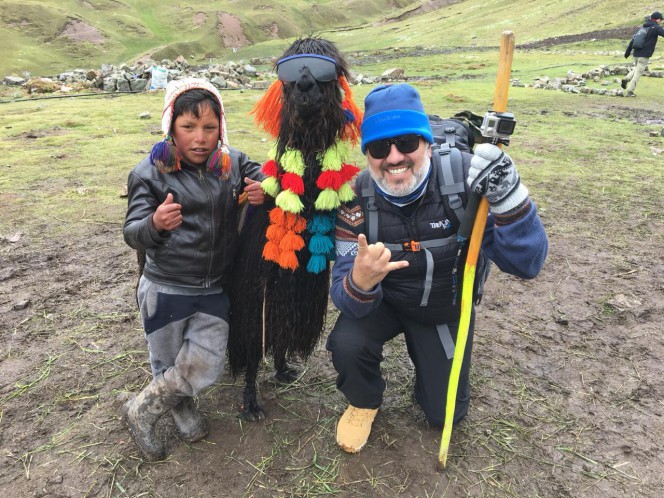 A primeira fase da subida tinha muita lama poia havia chovido e a Montanha estava coberta de neve também, mas a Viv seguiu bem faceira de rosa no centro na primeira fase da trilha antes de cuspir fora as folhas de Coca com uma pedra de Stevia que um amigo Chileno que conhecemos em Cuzco nos deu para aguentar o tranco do "soroche", ela aguentou bem só com água, não curtiu mascar as folhas com aquele açúcar empedrado de Stevia, baita guerreira.