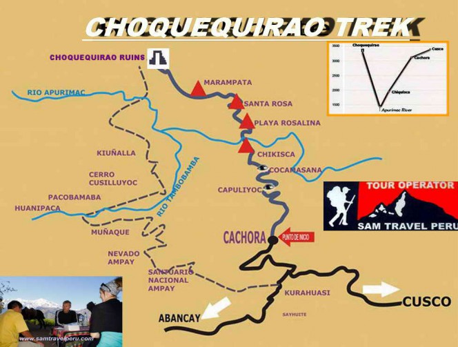 A cidadela de Choquequirao (berço de ouro, em português) está situada no vale do rio Apurímac, região de Cuzco, Peru. Está a 3033 mts de altitude e a única forma de se alcançá-la é por um árduo trekking de no mínimo 4 dias e 80kms. O ponto de partida é o povoado de Cachora, a cerca de 03hs de Cuzco. Choquequirao é um dos menos visitados sítios arqueológicos incas do Peru, apesar de ser um dos mais importantes e bem preservados. As explicações são a dificuldade do trekking e a falta de divulgação por parte do governo peruano. Para se ter uma ideia, enquanto 1500 pessoas visitam Machu Pichu por dia, cerca de 200 pessoas visitam Choquequirao por ano! No meu caso, por exemplo, fiquei uma manhã inteira sozinho pelas ruinas. Imagine estar só em Machu Pichu, com a cidade toda para vc. Esse é o sentimento em Choquequirao. Não obstante, esse panorama vem mudando nos últimos anos muito em função da divulgação nas redes sociais deste incrível e belíssimo trekking. Vale destacar que até hoje somente 30% da cidade foi escavada, e os arqueólogos continuam trabalhando, mesmo com os poucos recursos disponíveis. Abaixo segue um relato dia a dia para ajudar os mais intrépidos para que um dia se aventurem por lá.