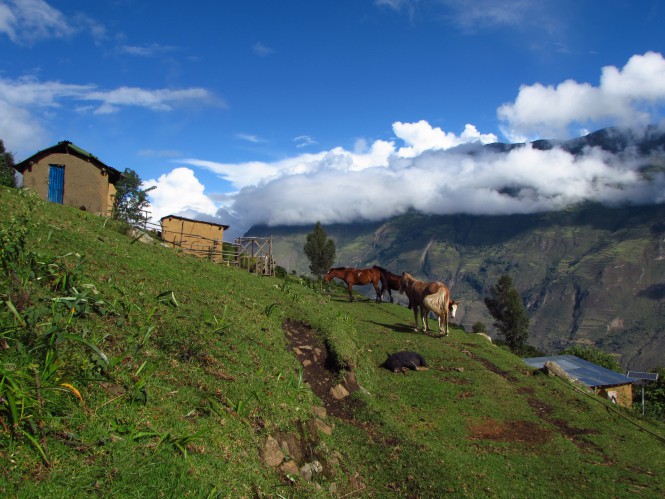 Bem, chegando em Marampata, armei a barraca e fui preparar algo para almoçar. Ainda teria umas 5 horas de luz solar, assim, daria tempo de ir a Choquequirao hoje mesmo! Estava muito ansioso. A primeira vez que ouvi falar desse trekking foi a vinte anos atrás! Desde então, nutria o desejo de estar ali. E agora faltava bem pouco! Enquanto almoçava, eis que a chuva voltou, com força dessa vez. Esperei por cerca de uma hora até passar. Logo depois, o tempo abriu e um lindo Sol deu as caras. Foi a senha para partir. Mochila de ataque nas costas, máquina fotográfica a tira colo, parti! Até a entrada do parque o caminho é por entre as casas dos camponeses. Muito interessante pois os animais como galinhas, porcos e cavalos ficam soltos, pastando e te encarando enquanto vc passa com suas roupas sintéticas coloridas. Um elemento estranho em meio a um cenário lindo e bucólico. Por todo o caminho é possível ver, ao longe, parte das ruinas do sitio. Ao chegar na entrada do parque, pude ver o caminho completo até lá, e me dei conta de que havia esquecido minha headlamp na barraca. Como não queria voltar na escuridão completa, decidi retornar ao camping e visitar a cidadela no outro dia pela manhã. Para quem já havia esperado 20 anos, tranquilo...
