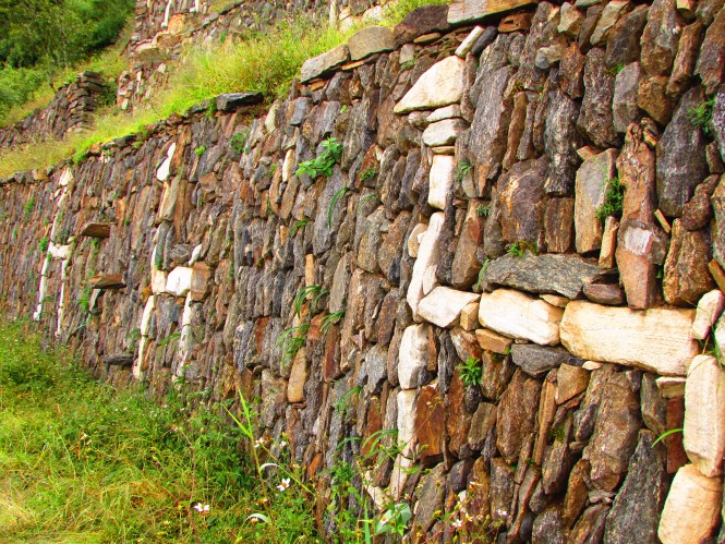 O setor mais interessante deste sitio é o das Lhamas. É uma sequência de terraços de pedra, muito íngremes, com pedras brancas incrustadas que formam desenhos de lhamas. É lindo e único em todos os sítios arqueológicos já descobertos até hoje! Queria muito conhecer. Contudo, como tudo aqui, nada é dado de graça. É necessário descer uma trilha por cerca de 30min e depois uma escadaria inca com quase 90º de inclinação! Assustador pois enquanto eu estava descendo era possível ver o rio Apurimac, 3000 mts abaixo de mim. Se eu caísse, provavelmente seria o local do meu tumulo.... Bem, depois disso, cheguei finalmente às lhamas. Muito interessante presenciar a criatividade e o esforço dispensado para construir tudo aquilo em um local de tão difícil acesso ainda hoje! A simbologia por trás daqueles muros deveria ser muito importante para aquelas pessoas.