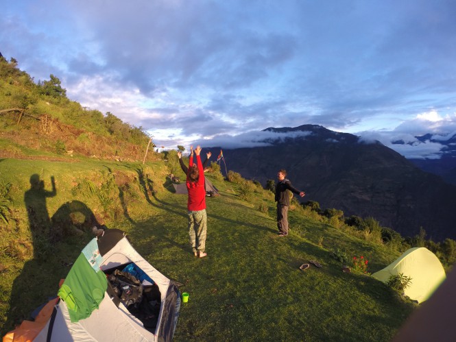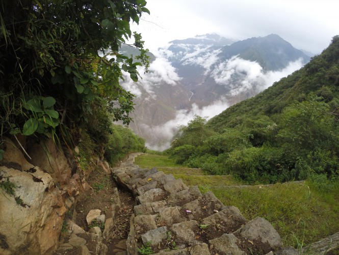 Depois de apreciar tudo durante muito tempo, hora de voltar. Ainda teria toda a subida e caminhada de volta até Marampata. Uma vez lá, almocei, arrumei tudo e me despedi de Choquequirao, com a certeza de ter estado em um dos lugares mais extraordinários do mundo. Meu plano era descer até o camping de Chuquisaca, 20min depois de Playa Rosalina, e pernoitar lá. Entretanto, conversando com uns canadenses que estavam acampados comigo em Marampata, mudei de ideia e resolvi ficar mais acima, em Cocamasama. Este local fica bem mais próximo de Capuliyoc, ponto final da trilha. Assim, toquei para baixo. Fiz um tempo melhor do que esperava até Playa Rosalina. No caminho, ainda encontrei um brasileiro, Rogerio, que estava subindo para Marampata. Conversamos um pouco, nos despedimos e segui em frente. Depois de Playa, o Sol abriu e me castigou. A trilha de volta até Cocamasana seria subir tudo que eu havia descido no primeiro dia. Muito punk! Nesse dia, caminhei ao todo 12hs, contando a ida e a volta até Choque. Cheguei em Cocamasana por volta das 20hs. Meus amigos canadenses estavam acampados lá e me receberam com calorosas boas-vindas. Daí foi armar tudo, comer e apreciar mais um belíssimo céu borrado de estrelas até pegar no sono. Apesar de ter andado bem mais, foi a melhor decisão ter pernoitado aqui, pois no quarto e último dia, a caminhada até Capuliyoc foi mais rápida. No dia seguinte, depois de umas 3hs, cheguei em Capuliyoc com a sensação de ter realizado mais um sonho! Estava muito feliz e emocionado por estar em um local tão remoto e ter conhecido um lugar tão incrível! Algum tempo depois os canadenses chegaram, famintos, pois toda sua comida havia acabado. Dei minhas bananas passas para eles, que nunca tinham visto ou comido. Se amarraram! Depois, abri um pacote de ovinhos de amendoim, aquelas bolinhas brancas com amendoim dentro. Eles comeram e disseram que aquilo era a coisa mais estranha e gostosa que eles jamais haviam comido rsrs!