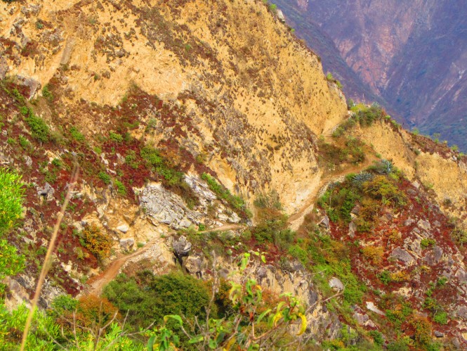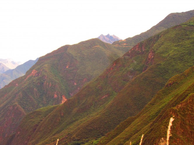 Nessa foto é possivel ver parte da dura trilha do segundo dia. Reparem no ziguezague da encosta, no canto superior direito, encostado na borda da foto. Eu vim lááá de baixo. Choquequirao esta no centro alto, ao fundo, aquela pequena parte desflorestada.