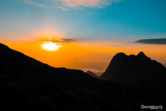 Ao descer esse lado para União é bem menos penoso. Chegando no União é bem discreto seu cume, no sentido do A1 vemos uma manifestação do clima. Partimos sentido Bicudão (Pico Ibitirati) mas antes Samuka levanta a bandeira branca, prosseguimos na subida ver as junções naquele ângulo mostra um pouco a linha que Dri sugeriu antes. Chegar no Ibitirati quase ao pôr do Sol me desanimou um pouco pois não teria tempo de ir em alguns locais de lá, mais um ponto ao aprendizado, e naquela porção o que sobrou foi ficar olhando vertentes do Pico Ferraria. O retorno foi tranquilo, antes de chegar ao PP, o vento molhado começa dar indícios da queda de temperatura, seguido das manifestações de raios aranha, fiquei viajando ali e pensando no trecho do Livro de Salmos capitulo 19. Iniciamos a descida com expectativa de passar no A2 e ver alguns conhecidos que não encontramos na subida. Chegando no A2 encontramos com a Glau Martins, And, Juliana Trev.