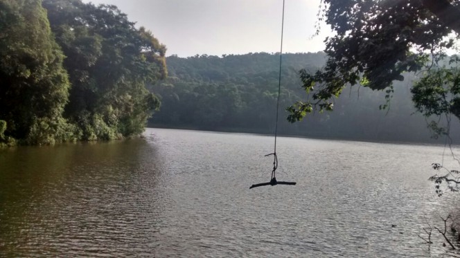 No final dela descobrimos mais tarde que tinha uma guarita que aparentava não ter como transpor, retornamos a uma bifurcação à direita bordejamos um cocuruto que seu início se avista o primeiro lago (conhecido pelos moradores como represa da Baita; nessa represa tem acesso feito por moradores de uns três lagos, em seguida a corredeira que vai formando as quedas principais de mesmo nome, ao longo da Trilha). Aê! Vai descendo cavalinho! Foi mesmo ainda em uma estrada aberta chega ao primeiro acesso do Lago, atento a uma entrada a esquerda. Encontramos um grupo (Bianca, Micheli, Beatriz e seu namorado) bem receptivos são moradores da região, então trocamos umas zideias, as boas setas foi os próprios nos orientando na caminhada ao contrária e ainda contando um pouco da evolução do Bairro que segue à 100km/h.