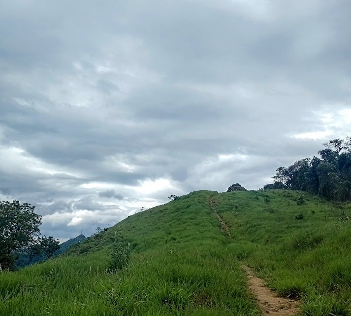Avançando ainda por trilha bem definida caímos numa clareira que ao lado tem uma vala, sua extensão parece nos levar a atravessar o morro, isso se não tivesse tomada pelo matagal, a partir daqui não tem mais trilha evidente exceto alguns rastros quase imperceptível. É danoso tentar se manter na crista devido a vegetação então fomos alternando entre crista e floresta; na crista para ver os possíveis mirantes e confirmar a orientação pelos marco e na floresta para navegação. Ruim disso que dávamos um balão para chegar na área navegável, ruim até dum zig-zag.
