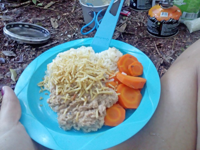 Depois no sol das 13h30 seguimos para a cachoeira ouro fala, a fome batia e lá fizemos o rango com direito a arroz, feijão, atum e cenoura. Daí seguimos umas 15h e foi caindo a noite, no meio do nada não achava minha lanterna, quase 18h passa um senhor bem na hora, eis o primeiro anjo do caminho, fala que Aiuruoca estava longe, uns 13km, olha bem nas nossas caras e pergunta se não queremos ir pra casa dele, o único morador num raio de sei lá 10km... sorte! Tinha 2 cachorros bravos, plantações de milho, sua casa era grande e simples, contou