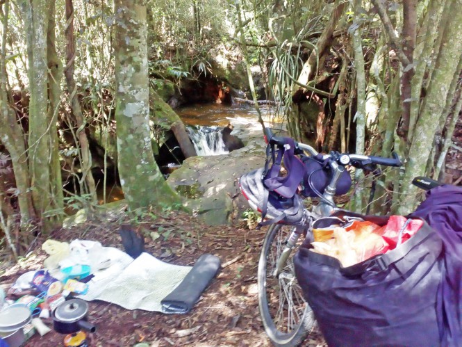 até itanhandu e depois itamonte, paramos para café na padaria e prosa com o Beto Nogueira, que conheci no grupo de cicloturismo aqui no FB, ele deu dicas e depois nos levou até o inicio da subida para a usina dos bragas. A meta era acampar no garrafão mas acabamos ficando no vilarejo cachoeirinha, cozinhamos o almoço num ponto de ônibus umas 15h, esperamos uma chuvinha safada passar e dormimos uma meia horinha, pois como a viagem de SP foi de noite, estávamos com o sono atrasado, ás 16h +- seguimos, chegamos ao fim do vilarejo cachoeirinha, já ia escurecer, sabíamos da baita subida á frente e qu ia ser dificil