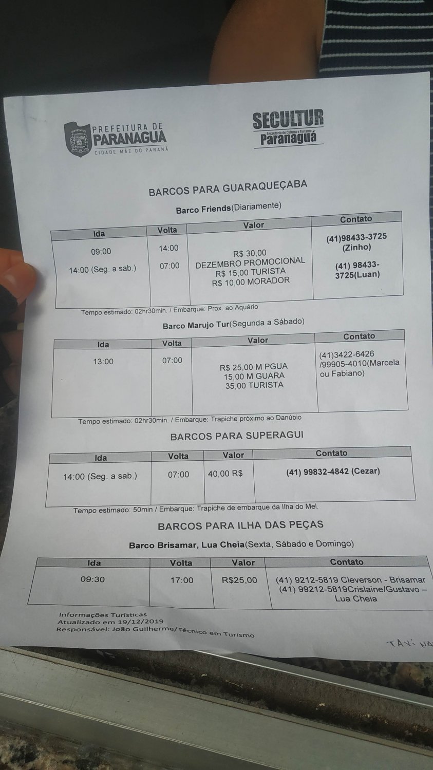 Balsa de Paranaguá x ilha das peças ás 9h30 (R$25), bem tranquilo de embarcar com a bike, no meu caso foi um dia atipico e teve de mudar de barco, ainda assim, tudo ok!
