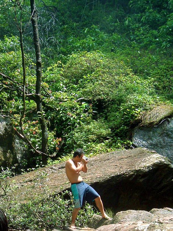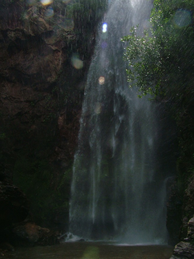 Depois fomos a uma outra cachoeira ainda mais bonita a Cachoeira Independência ou também conhecida como Cachoeira dos Malucos. Além da bela queda e poço ela tem ainda uma particularidade extraordinária: uma gruta logo atrás da queda onde por vezes a corrente de ar entra dentro dela e faz as gotas d'águas ficarem suspensas como se não sofressem os efeitos da gravidade! Infelizmente não tinha câmera esportiva na época, mas é impressionante!