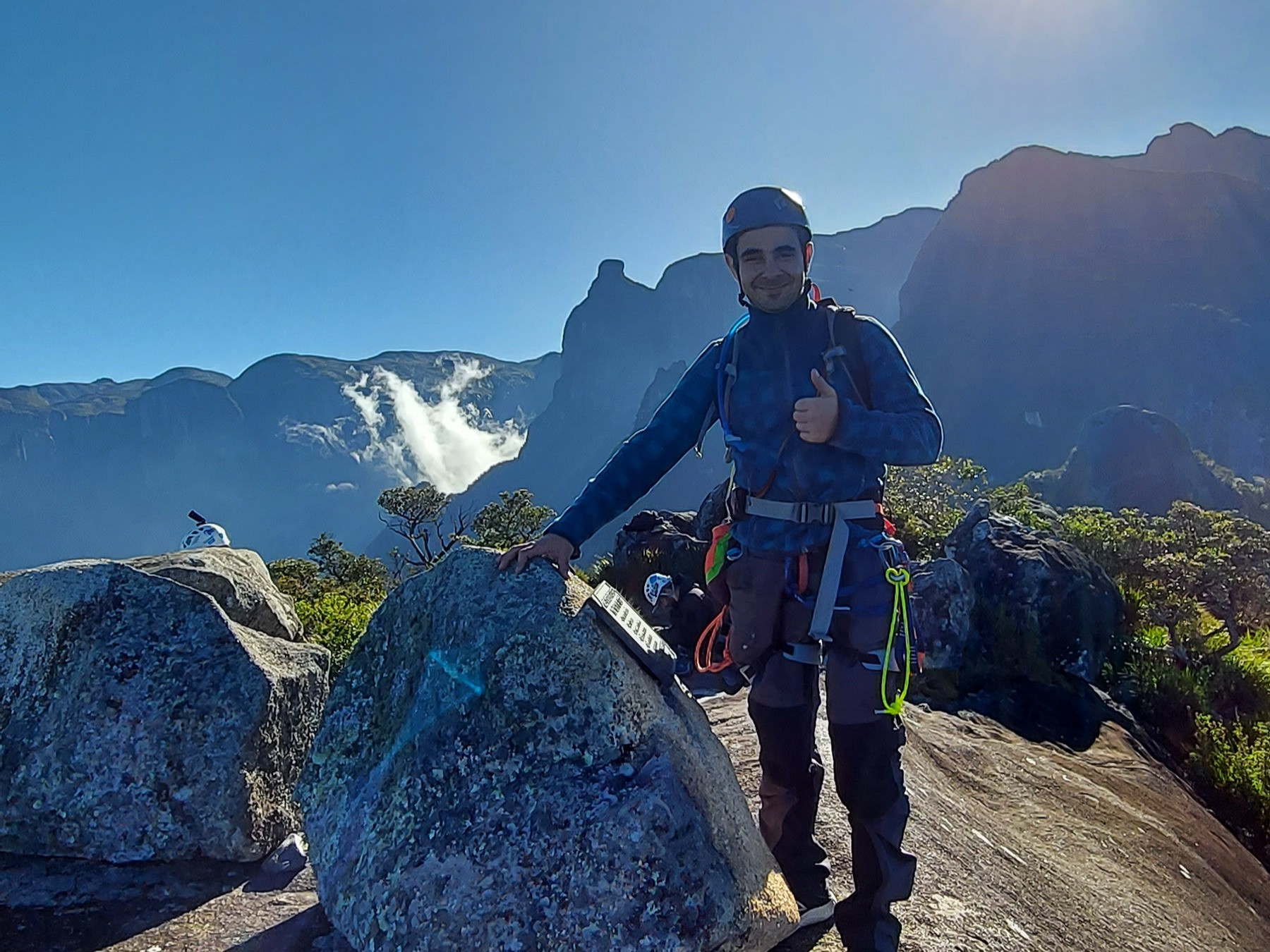 A quarta enfiada é uma chaminé gigante e com poucas proteções. Dá pra montar uma proteção com uma fita em um bloco de pedra bem óbvio que está entalado no meio da chaminé e antes do primeiro grampo. A p4 fica em um platô de onde se vê o abismo do Dedo. Eu, particularmente, evito olhar.