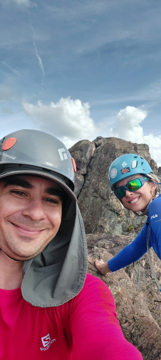 A via é toda fixa, muito bem protegida (E1) e com paradas duplicadas a cada 30 metros. Como no dia eu tinha 14 costuras no rack, fizemos a primeira cordada direto da base até a P2, que fica em um platô de onde é possível fazer a segurança confortavelmente.