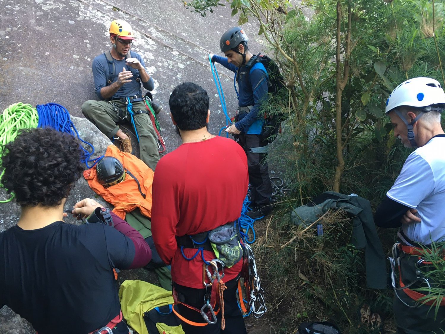 Os 4 primeiros rapeis são tranquilos e praticamente lineares, apesar de serem verticais. O problemático mesmo é o quinto. Primeiro pq a parada é horrivel, você fica totalmente supenso em uma parede lisa, sem nenhum reglete pra apoiar os pés. Além disso o rapel é em diagonal pra direita, mas o vento te joga pra esquerda. Para completar, o rapel tem mais de 60 metros, então o final consiste em manter a corda que voce puxa com nó, enquanto deixa a outra passar pelo ATC e toma uma queda controlada para acessar um platô da via Silvio Mendes. Nesse ponto pode-se descer por uma trilha bem ingreme ou rapelar mais 60 metros até a p1 da Silvio Mendes, que foi a nossa opção. A p1 da Silvio Mendes é o último rapel e necessita apenas de 1 corda. A partir dali caminha-se por cerca de 10 minutos e chega-se a trilha do capacete, que no nosso caso, aconteceu exatamente ao por do sol. Aproveitamos pra tomar um folego, fazer um lanche e nos equipar para terminar a trilha à noite.