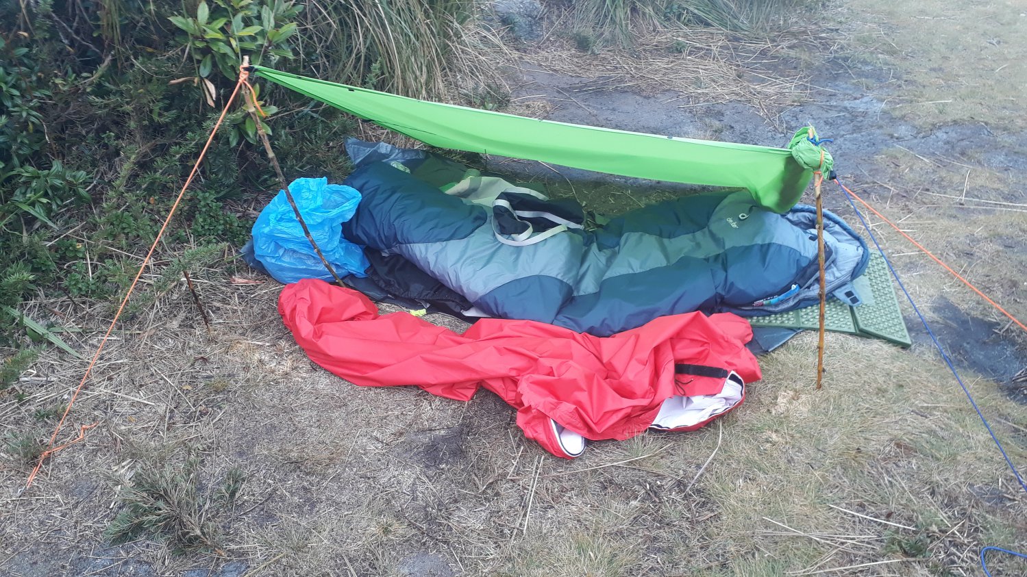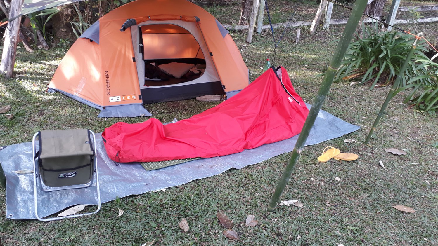 (A foto acima é do dia seguinte, quando já estava levantando acampamento. O saco de dormir e o saco de bivaque estão virados ao contrário nas fotos, porque eu já tinha começado a guardar quando lembrei de fotografar o setup).