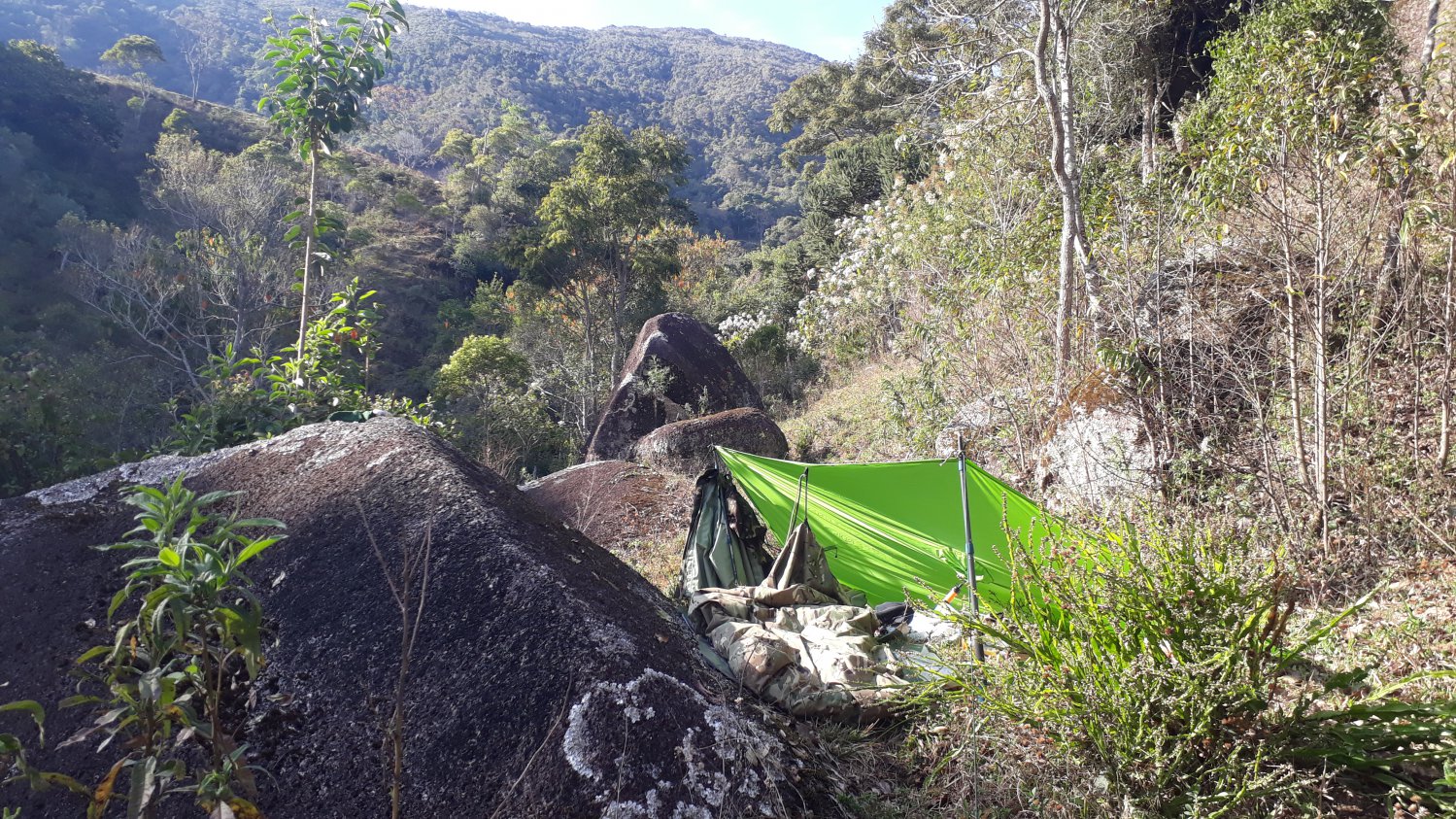 Voltando à minha experiência de bivaque no vale dos Ramos, mais uma vez passei um pouco de calor com o setup que estava testando (inconveniente que, como veremos, se transformou em vantagem no pico). Nesse caso, nem levei estacas, improvisei com pedaços de madeira e utilizei os bastões de caminhada para levantar o tarp.