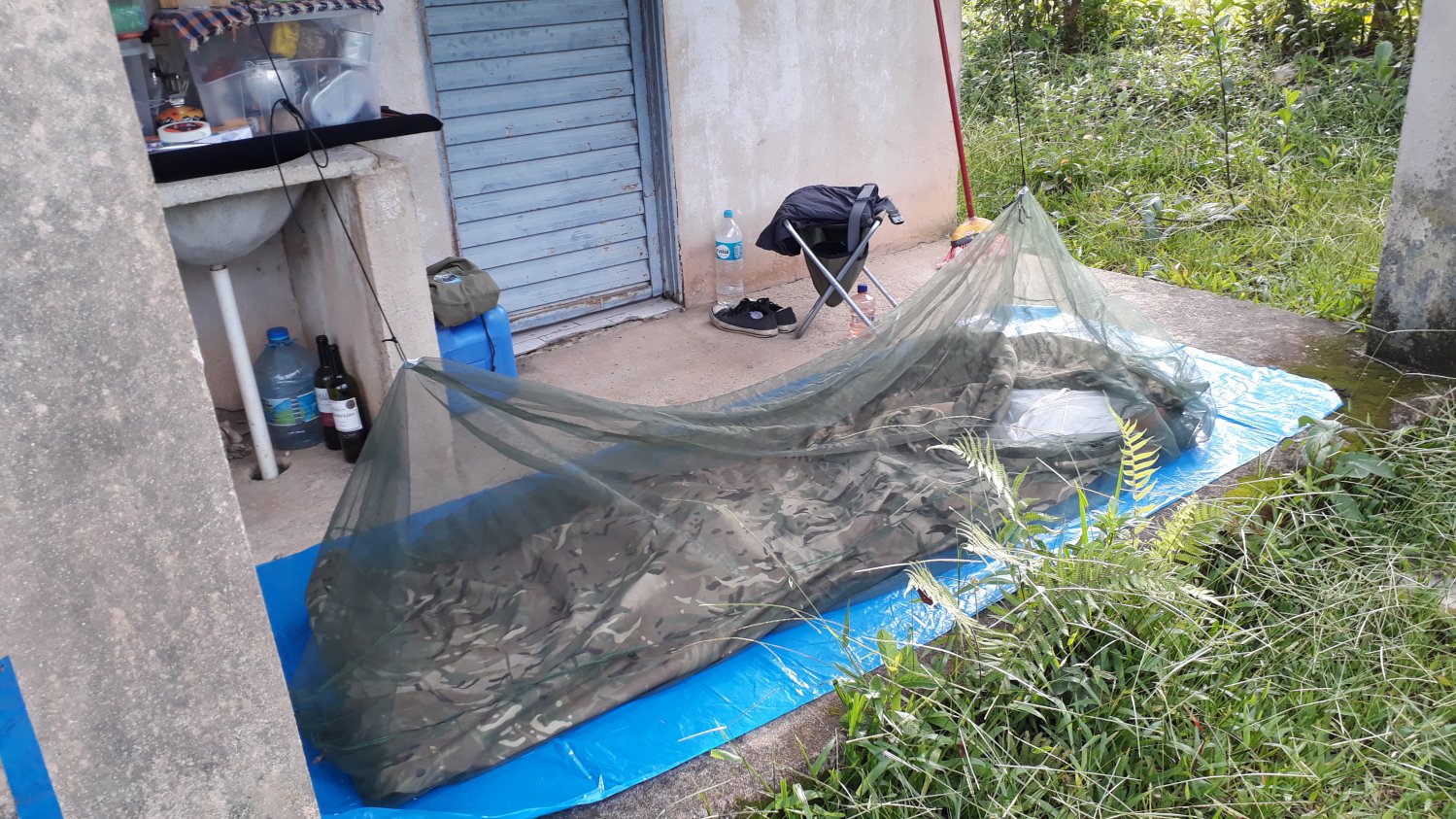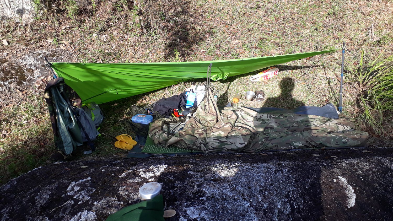 Já fazia um tempo que eu brincava com meus tarps, levantando eles em diversas configurações e treinando os nós. É imprescindível conhecer e praticar alguns nós adequados e aprender a prever a direção do vento para montar o tarp na melhor posição e configuração. Como cordame recomendo paracord, que é fácil de adquirir e mais do que resistente para a tarefa.