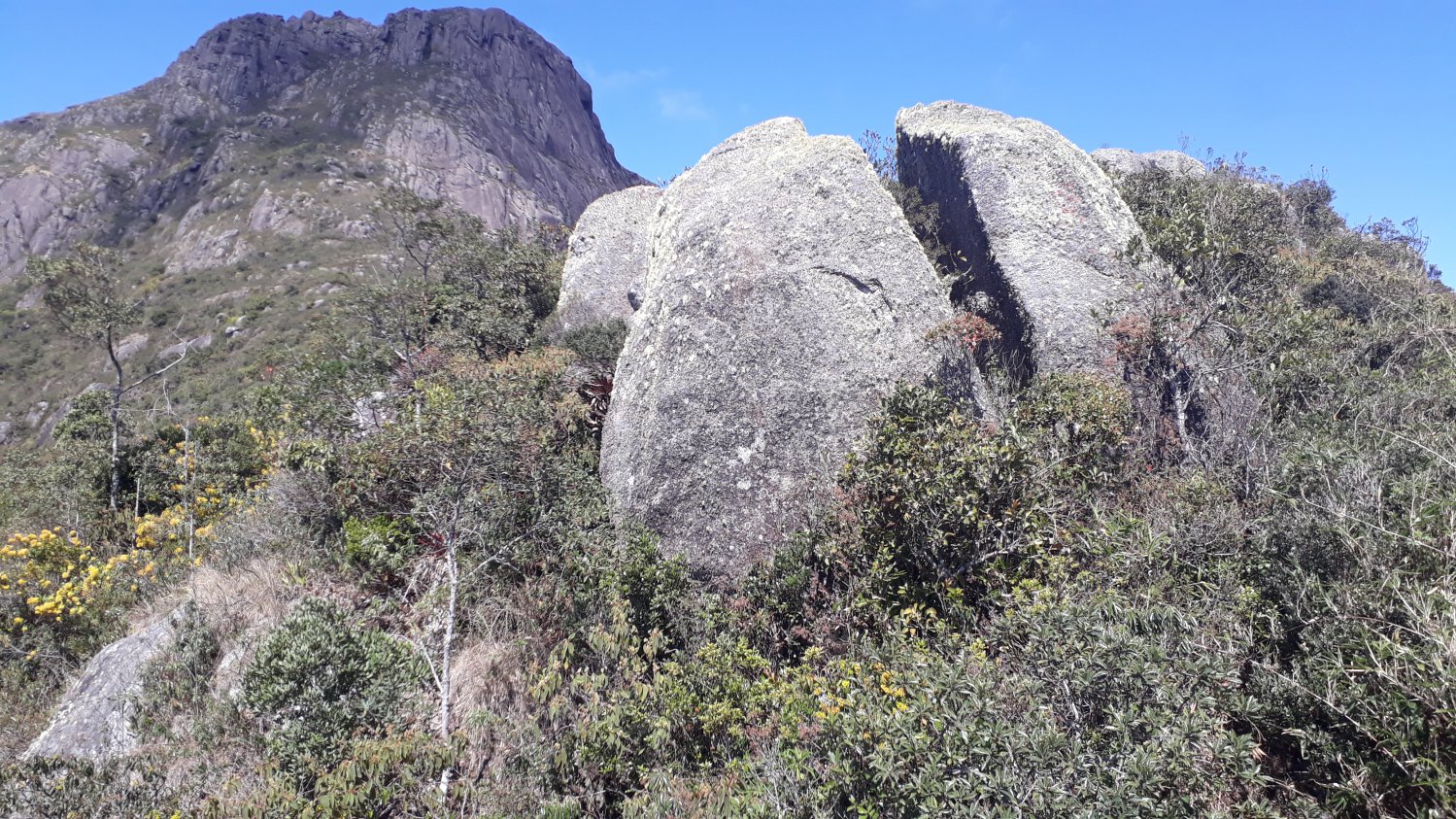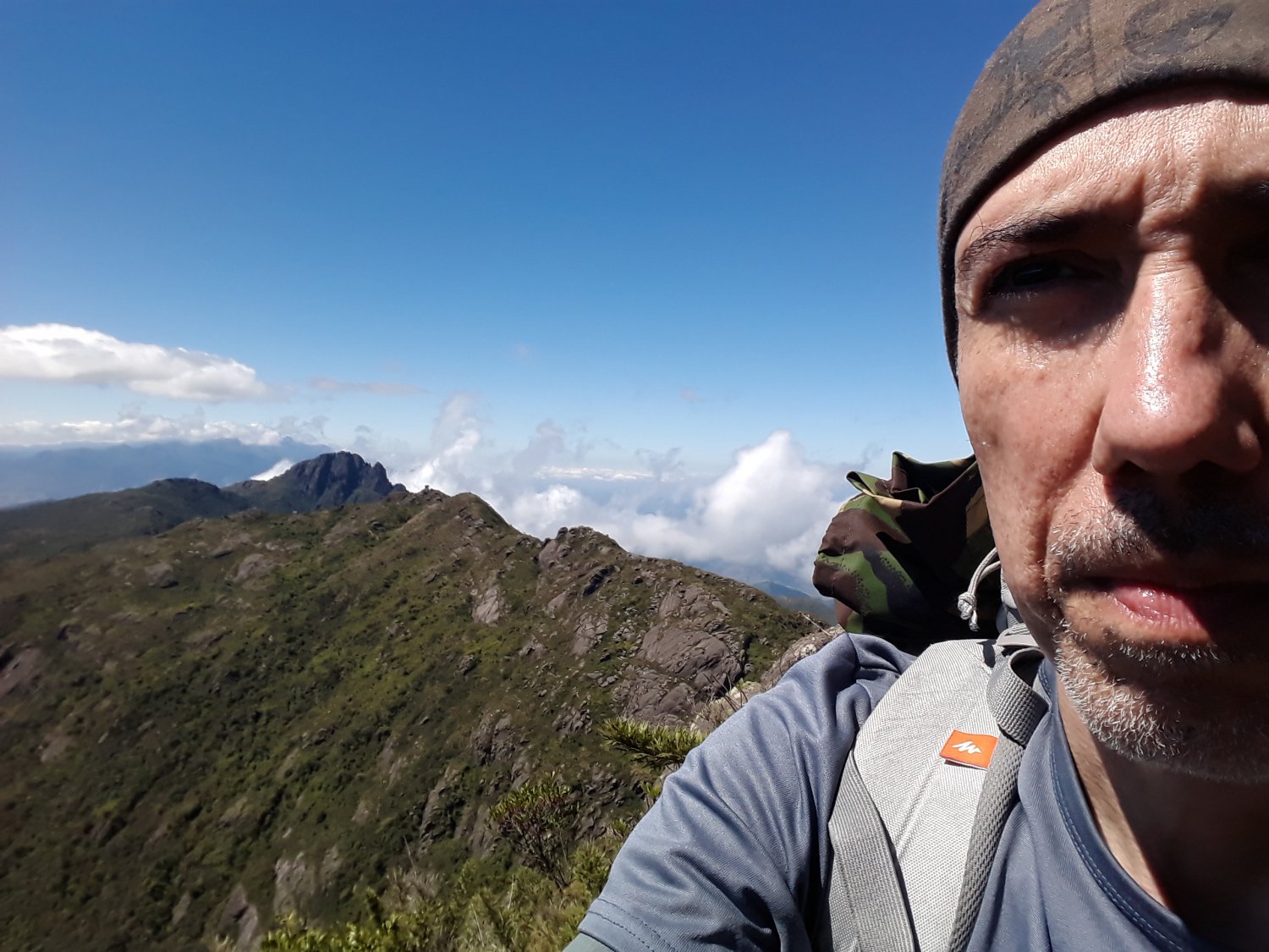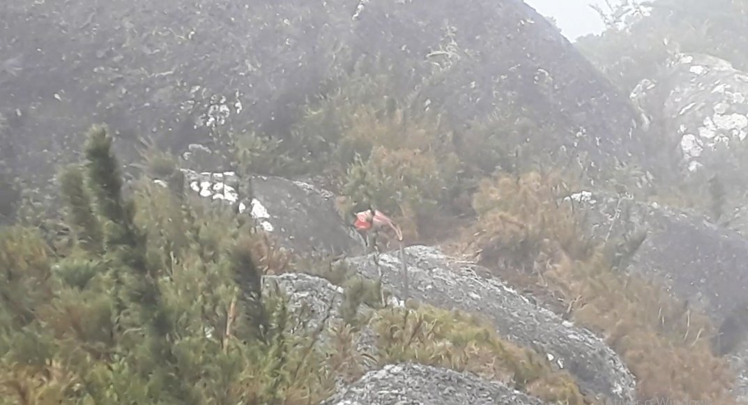 Me vi num labirinto de grotas espinhosas e fendas e percebi que eu estava perdido. Apesar de ver o Marinzinho a uns 300m dali, não sabia como retornar. Nesses casos, o importante é manter a calma. Como estava com o saco de bivaque, eu poderia me abrigar em qualquer fenda e dormir até o dia seguinte, e então só teria que aguardar o resgate do Denes, que era meu apoio na base (algo de fundamental importância no trekking solo). A bom é que o celular pega super bem na região do Marins, então falamos por whatsapp e enviei uma foto de onde estava. O Denes conhece cada rocha dali, e me orientou a subir um paredão ao sul que me levaria de volta à trilha. Amarrei a mochila com paracord, deixei ela no chão para ficar leve e escalei a parede de rocha. Chegando no alto, icei a cargueira e me vi de novo na trilha.