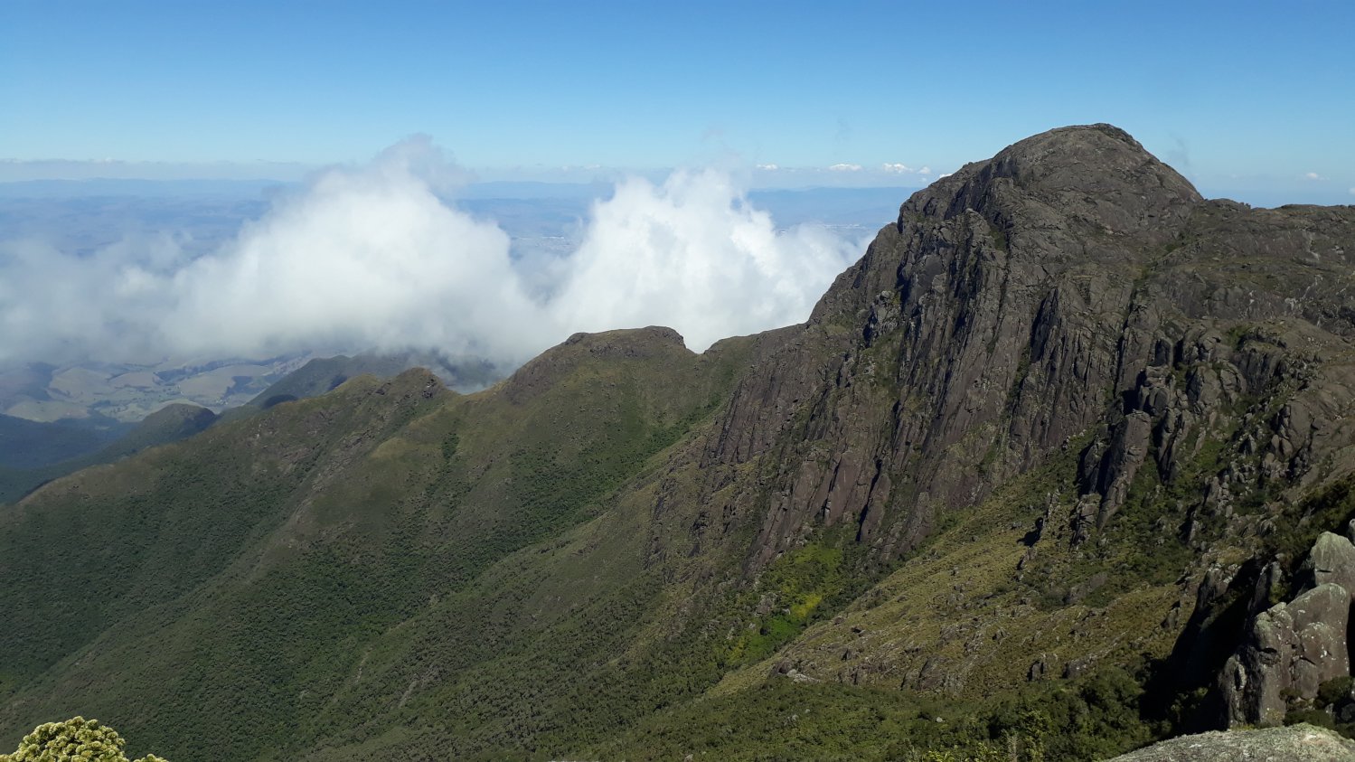 Passei rapidamente pelo pico do Marinzinho e comecei a descida. Estava mais perigoso, porque as pedras estavam molhadas e escorregadias, mas depois de descer uns 500m o tempo mudou completamente e a tormenta ficou para trás. O pico estava coberto de nuvens, mas abaixo estava aberto e tranquilo.