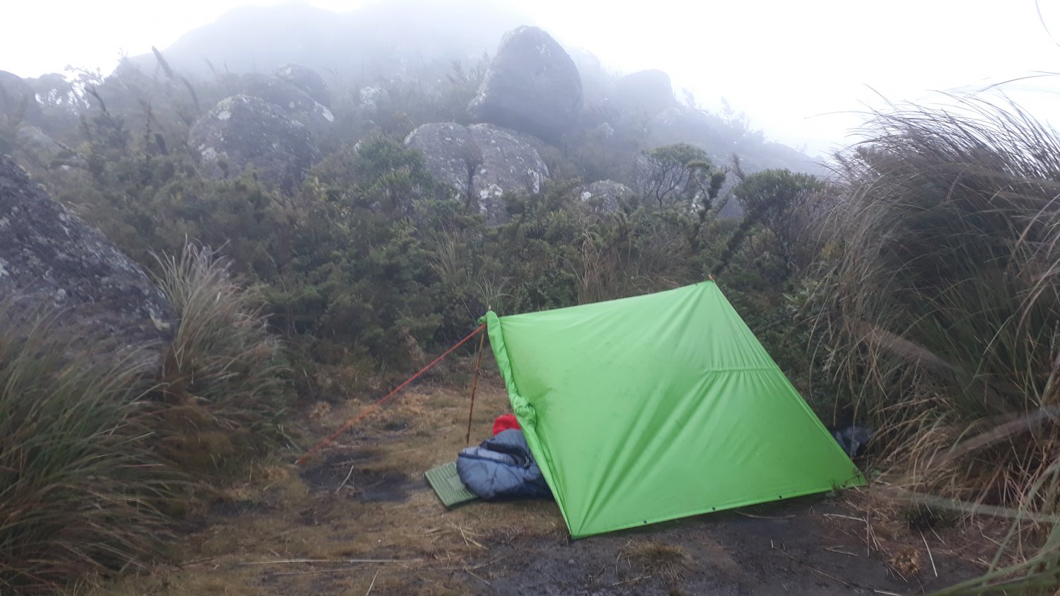 Aí cometi um primeiro erro, esqueci os bastões de caminhada no carro. Mesmo sabendo que lá no pico não havia madeira, pensei seria possível improvisar com bambuzinhos para levantar o tarp. Paciência, o importante é resover os problemas quando aparecem.